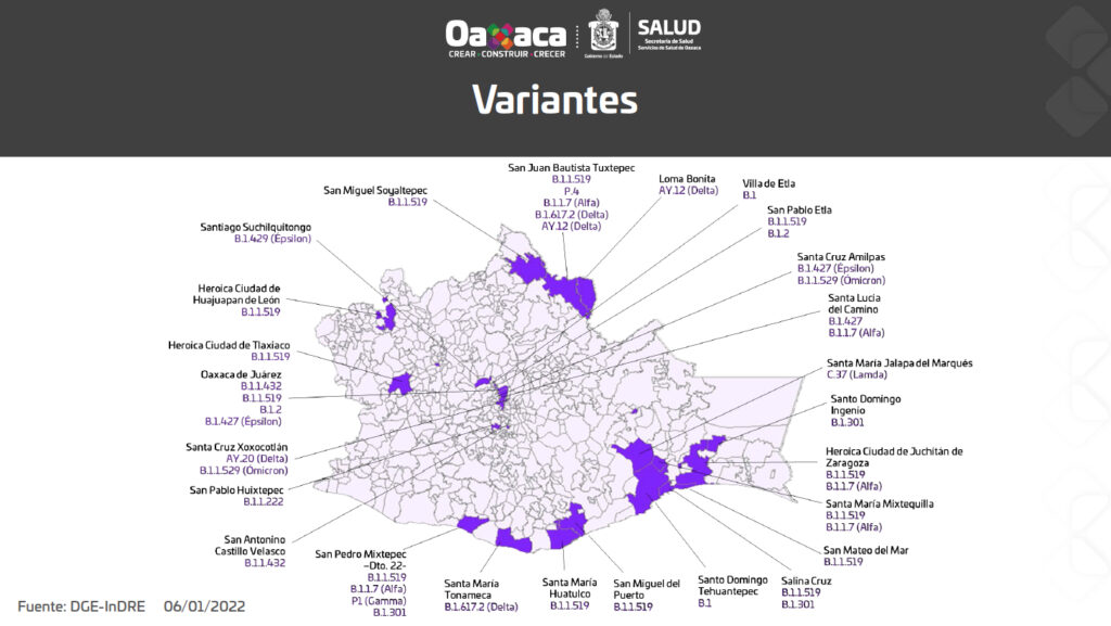 Oaxaca de Juárez, Oax. 06 de enero de 2022.- Los Servicios de Salud de Oaxaca (SSO), informan que hasta el corte de este día han sido notificados por parte de la Dirección General de Epidemiología (DGE) de la Secretaría de Salud federal y el Instituto de Diagnóstico y Referencia Epidemiológicos (InDRE), un total de 11 casos de la variante Ómicron en la entidad. El primero se confirmó a finales del 2021 y los 10 restantes este 6 de enero del año en curso.