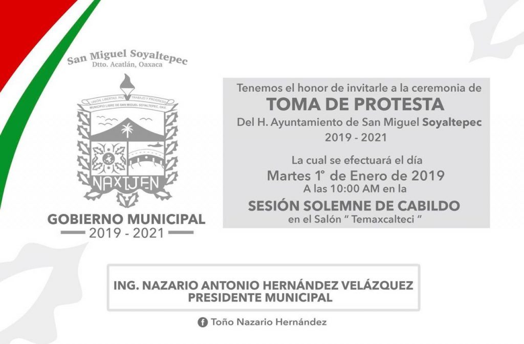 Conforme a lo marca la ley, el nuevo gobierno municipal de Soyaltepec, rendirá protesta ante el pueblo, en sesión solemne de cabildo que se encuentra programada para este 1 de Enero en el salón social Temascalteci, para que ahí, en medio de los habitantes que dieron el respaldo a Toño Nazario, el ingeniero, suceda a Julián Margarito y se convierta en el nuevo Presidente de este lugar.