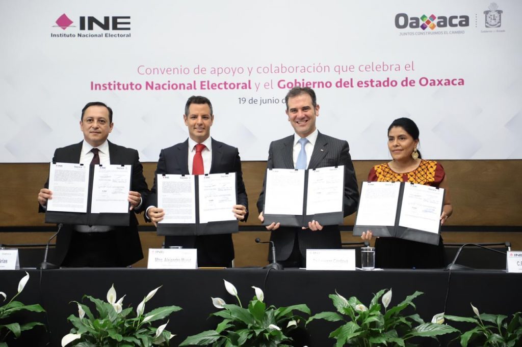 Ciudad de México. 19 de junio de 2019. El Gobierno de Oaxaca y el Instituto Nacional Electoral (INE) firmaron un convenio de apoyo y colaboración, con el cual se establecen las bases de coordinación para desarrollar proyectos enfocados a los pueblos y comunidades indígenas, en materia de participación cívica, electoral y democracia.