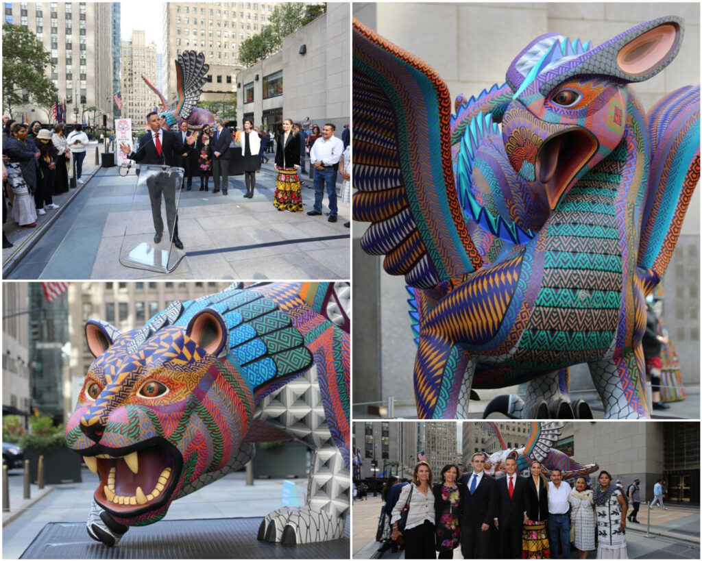 Nueva York. 22 de octubre de 2021.- “Quiero decirles que estoy muy agradecido, puesto que Oaxaca tiene un propósito que nos gusta resumir en una frase: queremos más Oaxaca en el mundo y más del mundo en Oaxaca. Y al estar aquí en el Rockefeller Center de Nueva York, develando estos alebrijes e iniciando esta jornada festiva de promoción económica y cultural, sabemos que estamos logrando ese propósito”, destacó el gobernador Alejandro Murat Hinojosa al presentar las obras de los artesanos oaxaqueños Jacobo y María Ángeles, colocadas en el emblemático Rockefeller Center de esta ciudad.