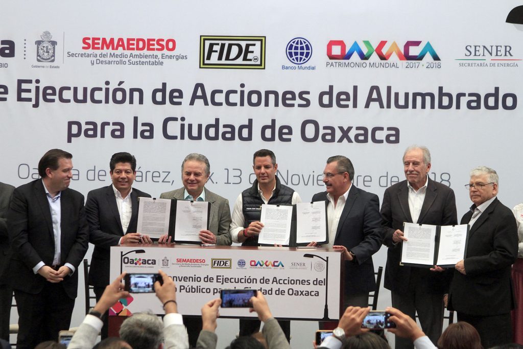 Oaxaca de Juárez, Oax., 13 de noviembre de 2018.- La ciudad de Oaxaca tendrá un nuevo rostro de noche ya que será sustituida la infraestructura del alumbrado público que se encuentra en mal estado, lo anterior derivado de un convenio firmado por el Fideicomiso para el Ahorro de Energía Eléctrica (Fide), la Secretaría de Energía (Sener) y el municipio capitalino, el cual fue atestiguado por el gobernador Alejandro Murat Hinojosa y el secretario de energía, Pedro Joaquín Coldwell.