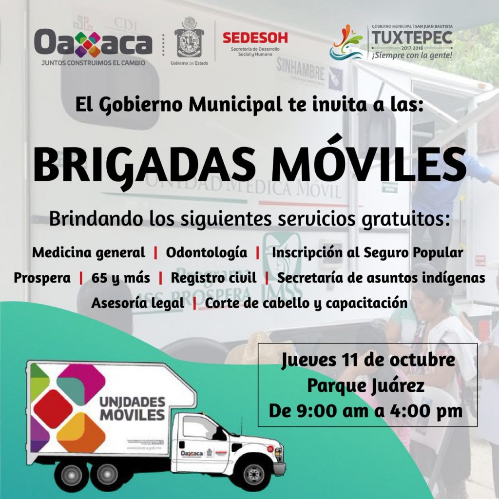 Jiménez Gómez asentó que los servicios de las Brigadas Móviles del Gobierno del Estado de Oaxaca serán abiertos a toda la población y totalmente gratuitos. Estas brigadas se instalarán en el parque “Benito Juárez” en un horario de nueve de la mañana a cuatro de la tarde.