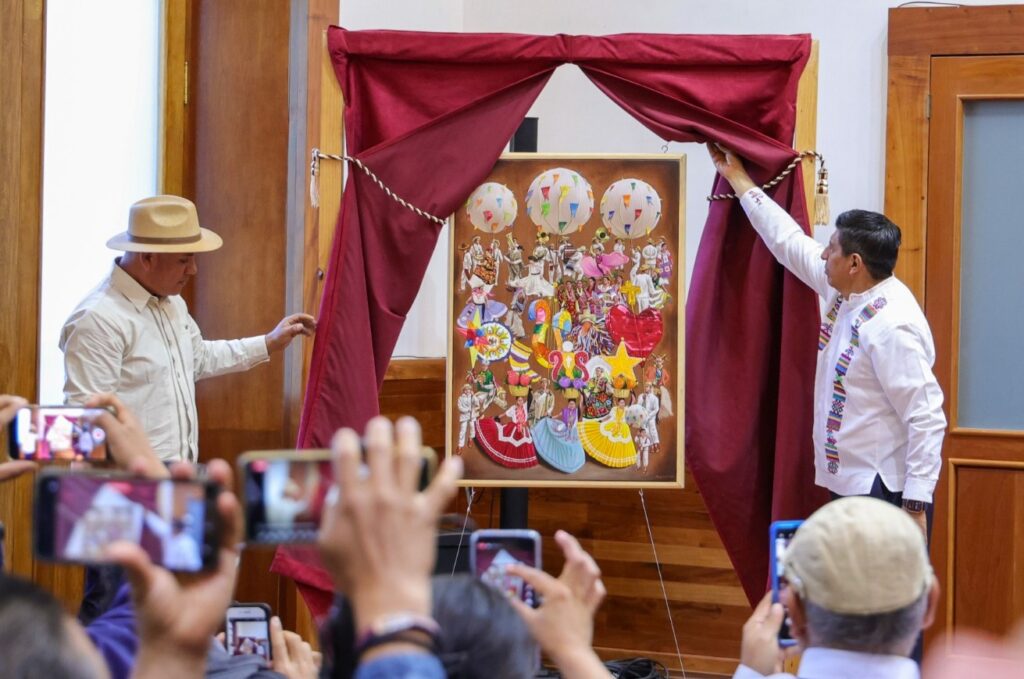 Oaxaca de Juárez, Oax. 25 de marzo de 2024. “Calenda de la Hermandad” una obra del artista plástico Oscar Aparicio Mendoza, originario de la Heroica Ciudad de Tlaxiaco, fue seleccionada como la imagen oficial de la Guelaguetza 2024.