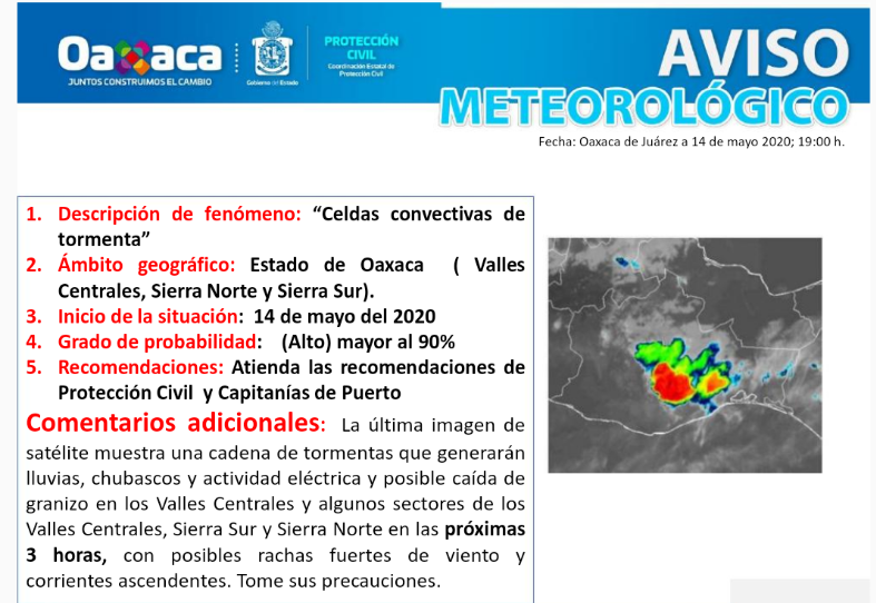 Oaxaca de Juárez, Oax. 14 de mayo de 2020.-La Coordinación Estatal de Protección Civil de Oaxaca (CEPCO) informa que en las próximas horas se esperan lluvias, chubascos y actividad eléctrica con posible caída de granizo en Valles Centrales y algunos sectores de la Sierra Sur y Sierra Norte.