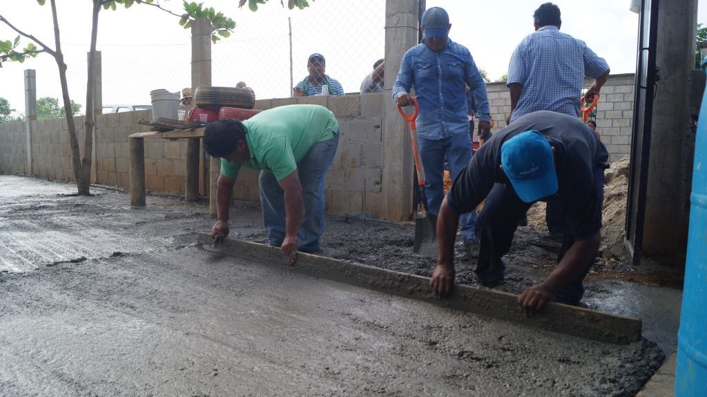 Palas y cubetas en mano para acarrear arena y llevar al hombro hasta la revolvedora de donde salían llenas de cemento hacia el espacio a pavimentar en donde esperaban con cucharas y la regla, hombres y mujeres trabajaron durante tres horas y media en la construcción de la plaza cívica.