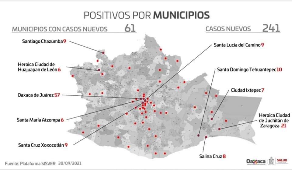 Los 241 casos nuevos, afectan a 61 municipios, siendo el de Oaxaca de Juárez el primer lugar con 57, seguido de Juchitán de Zaragoza con 21, Santo Domingo Tehuantepec 10, Santa Cruz Xoxocotlán, Santa Lucía del Camino y Santiago Chazumba nueve cada uno, Salina Cruz ocho, Ciudad Ixtepec siete, Huajuapan de León, y Santa María Atzompa seis cada uno, el resto de cinco a un solo caso.