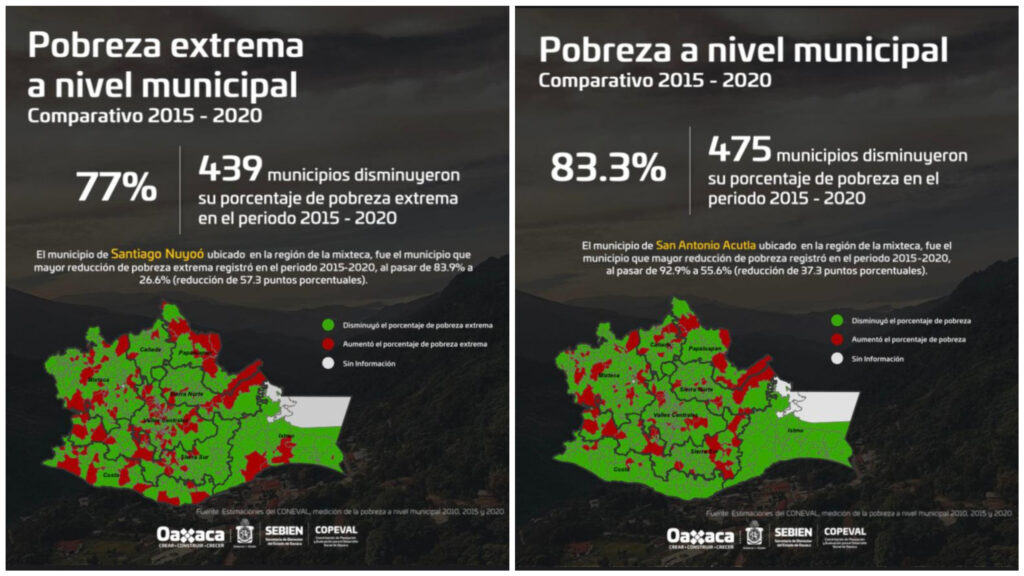 En este sentido -puntualizó el responsable de la política social del estado- el municipio de Santiago Nuyoó ubicado en la región de la Mixteca, fue el municipio que mayor reducción de pobreza extrema registró en el periodo 2015-2020, al pasar de 83.9% a 26.6% (Es decir una reducción de 57.3 puntos porcentuales).