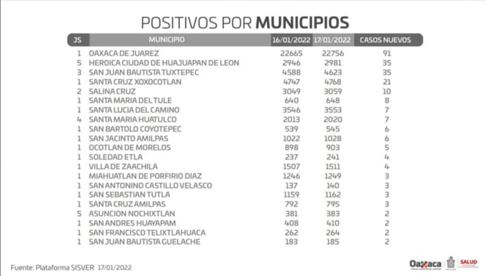 En tanto, los 284 casos positivos se distribuyen de la siguiente manera: Oaxaca de Juárez con 91, Heroica Ciudad de Huajuapan de León y San Juan Bautista Tuxtepec 35 cada uno, Santa Cruz Xoxocotlán 21, Salina Cruz 10, Santa María del Tule ocho, Santa Lucía del Camino y Santa María Huatulco siete cada uno, San Bartolo Coyotepec y San Jacinto Amilpas seis cada uno, el resto de cinco a un solo caso.