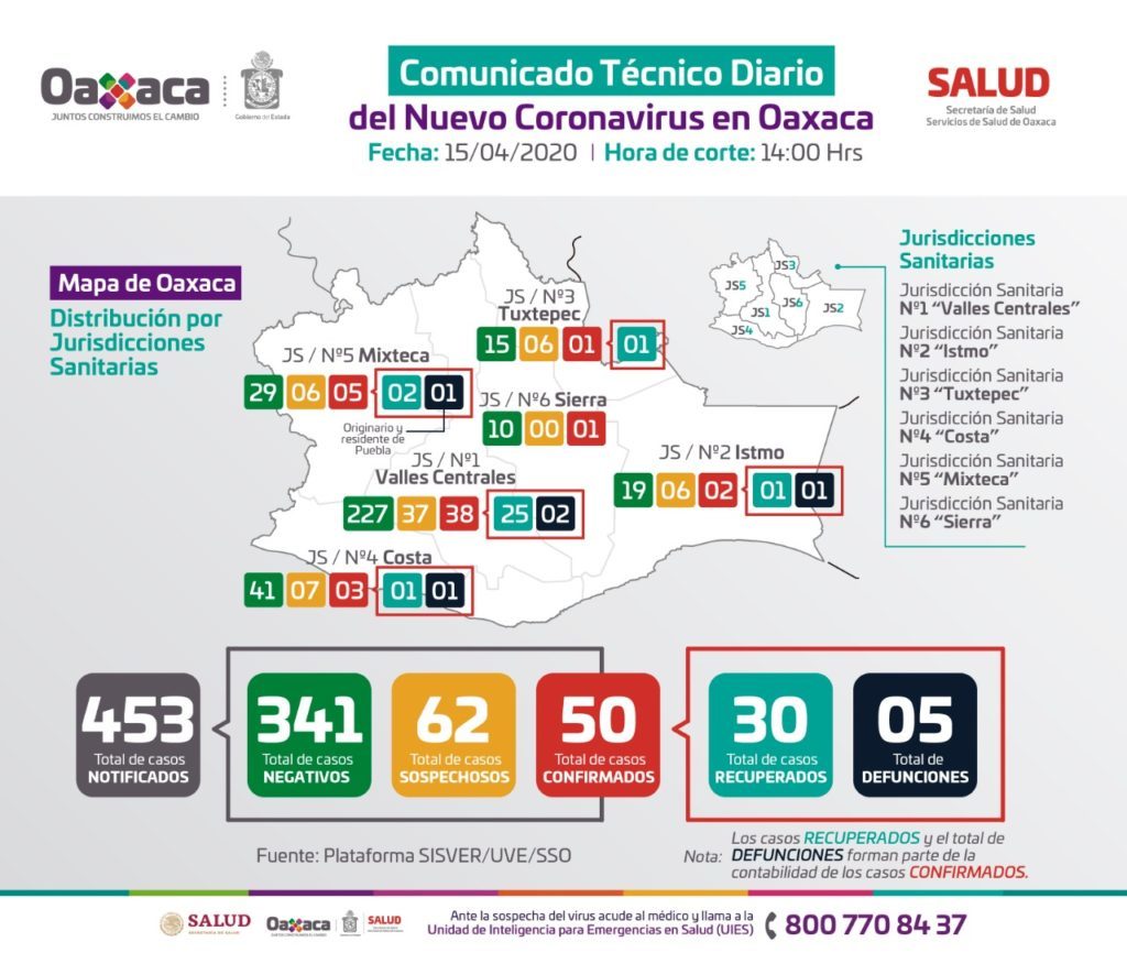 Oaxaca de Juárez, Oax. 15 de abril de 2020.- Los Servicios de Salud de Oaxaca (SSO) confirmaron cuatro nuevos casos de COVID-19 en la entidad; con ello, hasta este miércoles 15 de abril, suman 50 pacientes positivos, siendo Valles Centrales la Jurisdicción Sanitaria más afectada.
