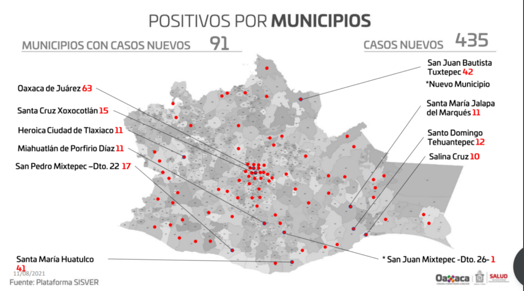 Los 435 casos nuevos afectan a 91 municipios, siendo el de Oaxaca de Juárez el primer lugar con 63, seguido de San Juan Bautista Tuxtepec con 42, Santa María Huatulco 41, San Pedro Mixtepec (Distrito 22) con 17, Santa Cruz Xoxocotlán 15, Santo Domingo Tehuantepec 12; Santa María Jalapa del Marqués, Miahuatlán de Porfirio Díaz y Tlaxiaco 11 cada uno, Salina Cruz 10 y el resto de ocho a un solo caso.