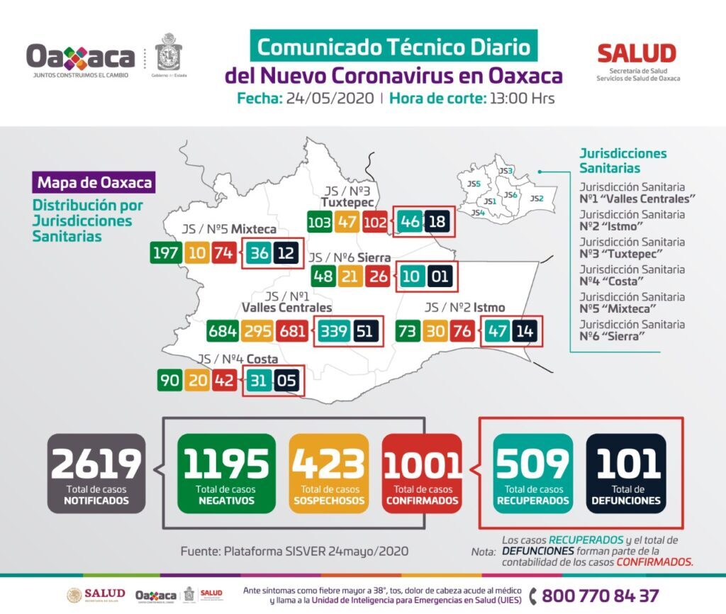 Oaxaca de Juárez, Oax. 24 de mayo de 2020. El titular de los Servicios de Salud de Oaxaca (SSO), Donato Casas Escamilla informó que al corte de este domingo 24 de mayo, se tienen contabilizados 37 casos nuevos, que hacen un total de mil un casos positivos a COVID-19 en la entidad.