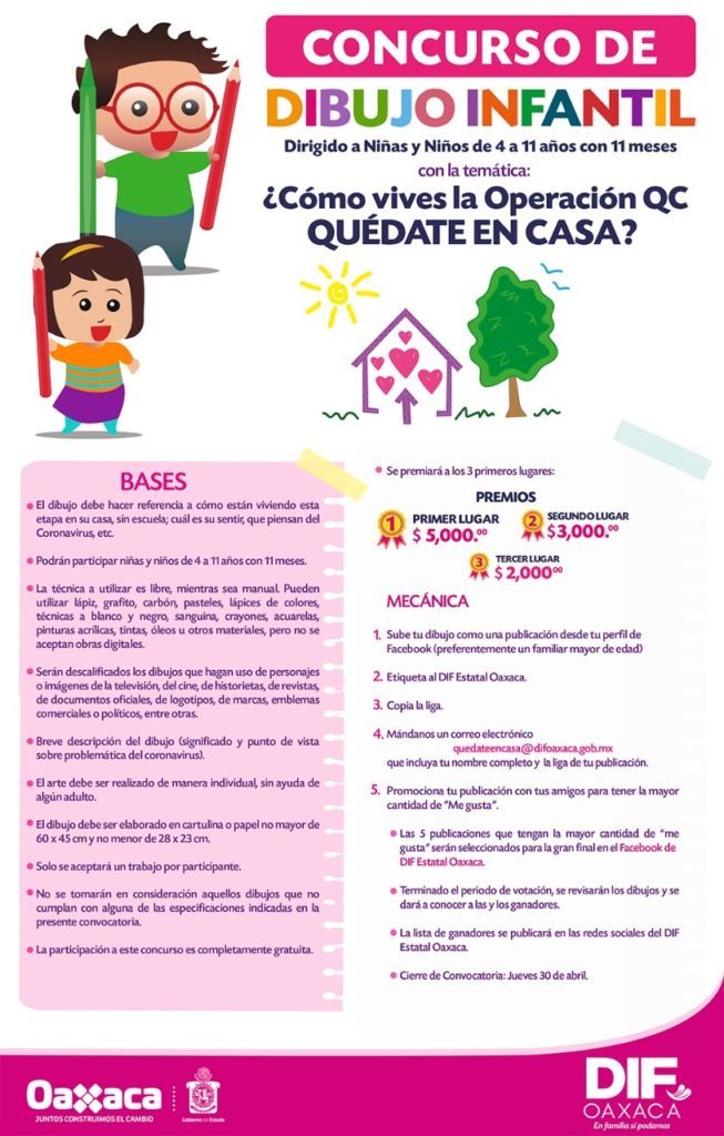Fortalecer la atención y el sano esparcimiento de nuestras niñas y niños oaxaqueños desde casa y durante esta época de pandemia, es una prioridad para el Gobierno del estado de Oaxaca, el cual encabeza el maestro Alejandro Murat Hinojosa, por ello, la presidenta honoraria del Sistema para el Desarrollo Integral de la Familia (DIF) Oaxaca, Ivette Morán de Murat, convoca a niñas y niños de 4 a 11 años 11 meses al Concurso de Dibujo ¿Cómo vives la Operación QC «Quédate en Casa»?