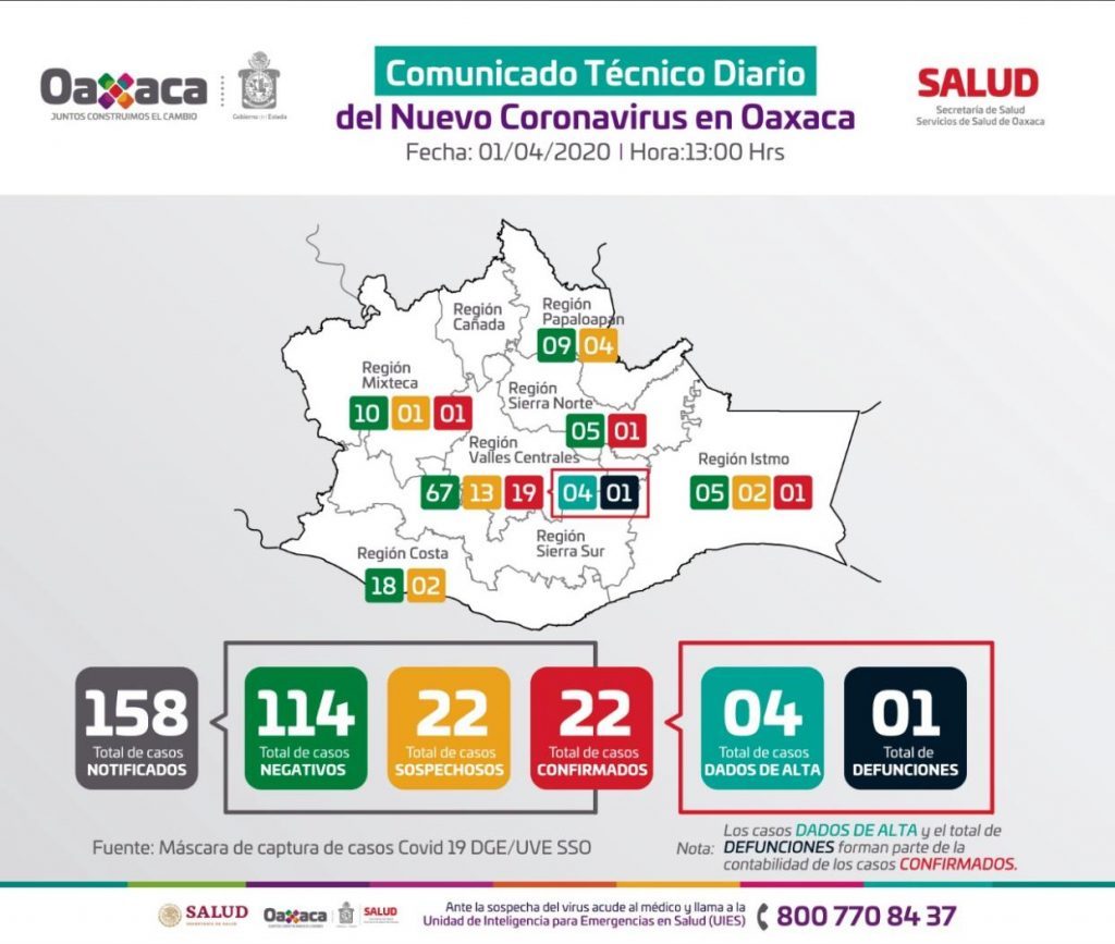 Al corte del 1 de abril del presente año, suman 158 notificaciones: 10 más en comparación del día de ayer, de este global, se han descartado 114 casos, se tienen en estudio 22 sospechosos, y se han dado de alta médica a cuatro oaxaqueños que dieron positivo a la enfermedad, al cumplir los 14 días de aislamiento social.