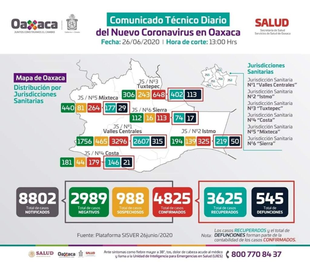 En representación del titular de los SSO, el funcionario explicó que del global de positivos, 276 son casos nuevos, se tiene en espera de resultados 988 pruebas, 545 personas han perdido la vida lamentablemente, 22 más que el día de ayer; así también tres mil 625 oaxaqueñas y oaxaqueños se han recuperado del padecimiento infeccioso.