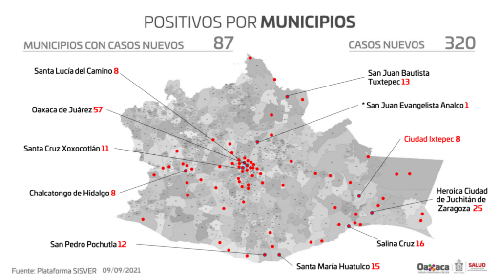 En este mismo periodo se identificaron 87 municipios con presencia de contagios nuevos, siendo Oaxaca de Juárez el que mayor número presentó con 57 casos, la Heroica Ciudad de Juchitán de Zaragoza con 25, Salina Cruz con 16, Santa María Huatulco con 15, San Juan Bautista Tuxtepec con 13, por mencionar algunos. Por primera vez en la lista de ayuntamientos con la presencia del virus se notificó a San Juan Evangelista Analco en la región de la Sierra Norte con un caso.