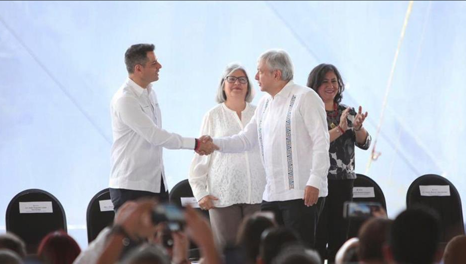 El gobernador Alejandro Murat Hinojosa acompañó el presidente de México, Andrés Manuel López Obrador a la presentación del Plan Nacional para la Producción de Hidrocarburos en Campeche.