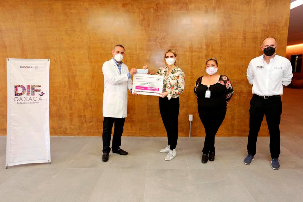 Oaxaca de Juárez, Oax. 4 de octubre del 2021.- En el marco del mes de la sensibilización sobre el cáncer de mama y continuando con las gestiones en beneficio de la salud de las oaxaqueñas en las 8 regiones del estado, la presidenta honoraria del Sistema para el Desarrollo Integral de la Familia (DIF) Oaxaca, Ivette Morán de Murat, entregó un donativo de 50 mil pesos a la Fundación de Cáncer de Mama (FUCAM) A.C.