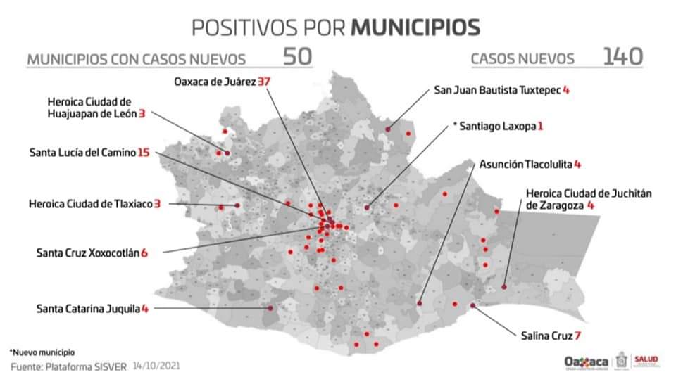 Los 140 casos nuevos de COVID-19, afectan a 50 municipios, siendo los principales: Oaxaca de Juárez con 37, Santa Lucía del Camino 15, Salina Cruz siete, Santa Cruz Xoxocotlán 6, Asunción Tlacolulita, Juchitán de Zaragoza, San Juan Bautista Tuxtepec y Santa Catarina Juquila cuatro cada uno, Huajuapan de León, Tlaxiaco, Matías Romero Avendaño y San Jerónimo Tlacochahuaya tres cada uno, el resto de dos a un solo caso.