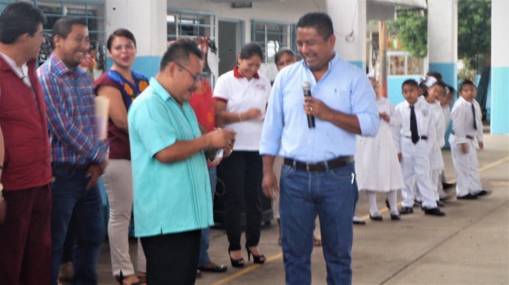 Tuxtepec, Oaxaca.- La educación es el combustible que hace a los niños y jóvenes ser hombres de bien y profesionistas que contribuyen en el desarrollo, crecimiento y prosperidad de este municipio, de Oaxaca y de México, afirmó el Presidente Fernando Bautista Dávila al hacer entrega de un apoyo económico de 40 mil pesos para la compra de cemento para la loza del techado de dos aulas escolares que fueron dañadas por el sismo del 2017, que tuvieron que ser demolidas y se reconstruyeron con un tequio que encabezó el Gobierno Municipal de Tuxtepec.