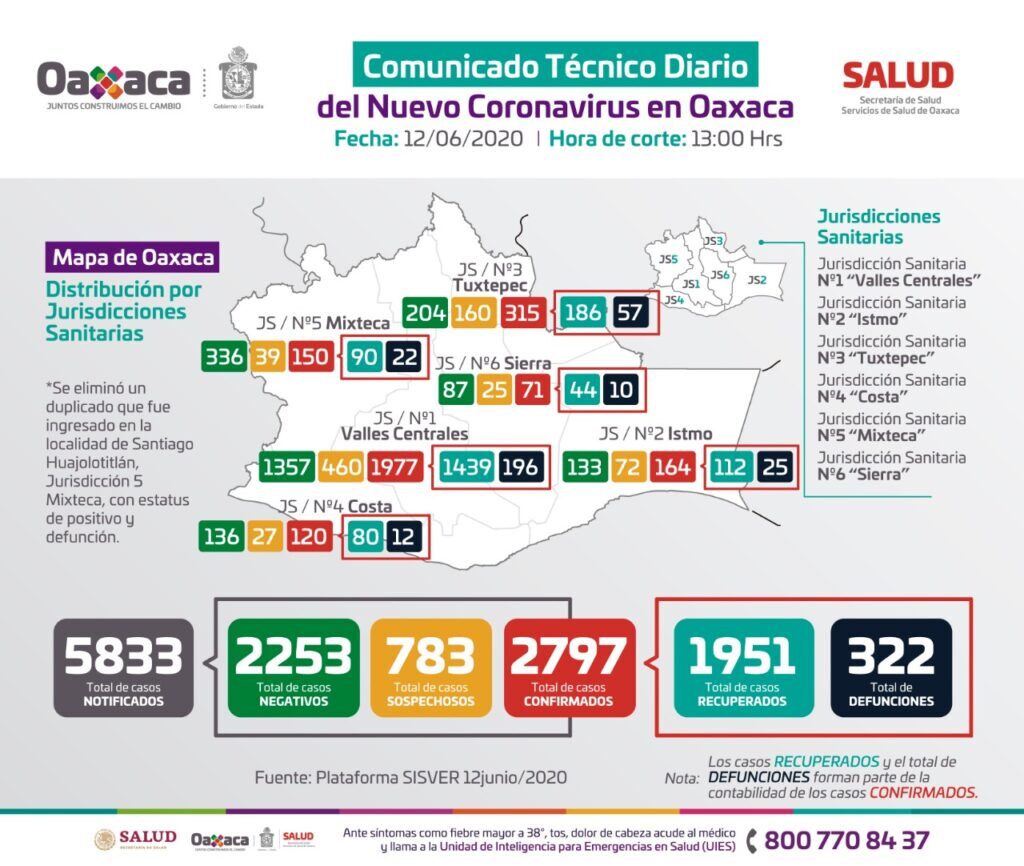 Oaxaca de Juárez, Oax. 12 de junio de 2020.-En Oaxaca se reportan dos mil 797 contagios de COVID-19, mientras que 524 casos se mantienen activos y 783 personas están en espera de resultados por laboratorio.