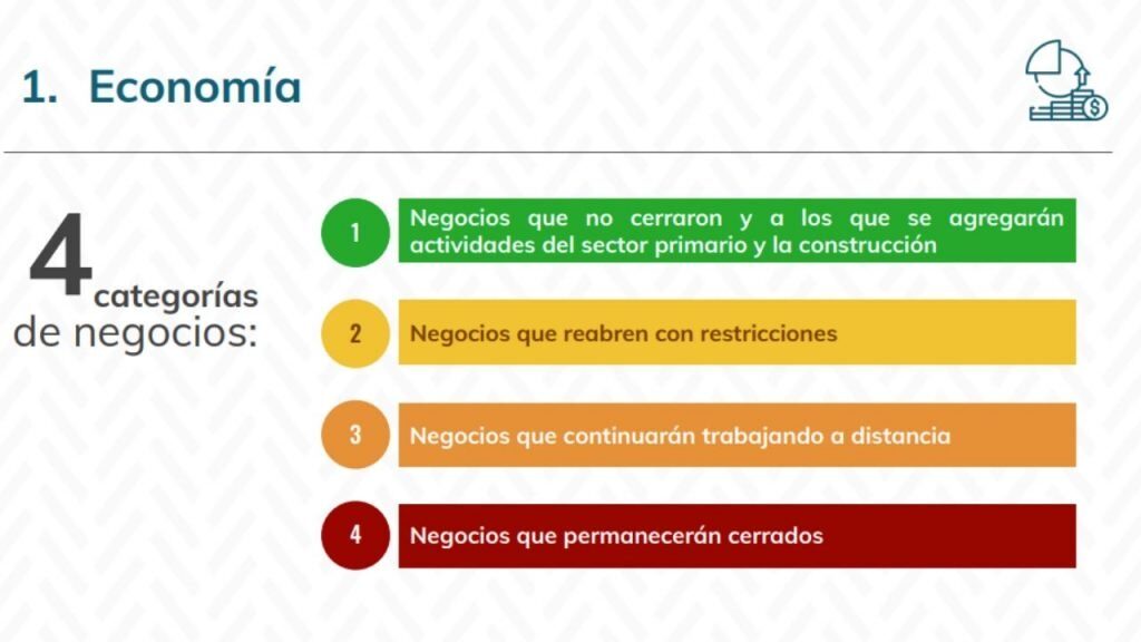 En éste se contemplan 4 categorías de negocios y es así que en la segunda categoría se advierte que restaurantes, tiendas departamentales, servicios jurídicos, bufetes de abogados, servicios religiosos, cines y teatros, deporte sin público, bancos y servicios financieros, trámites y servicios de gobierno (atención al público) y consultas médicas reabrirían con restricciones a partir del 15 de junio de 2020.
