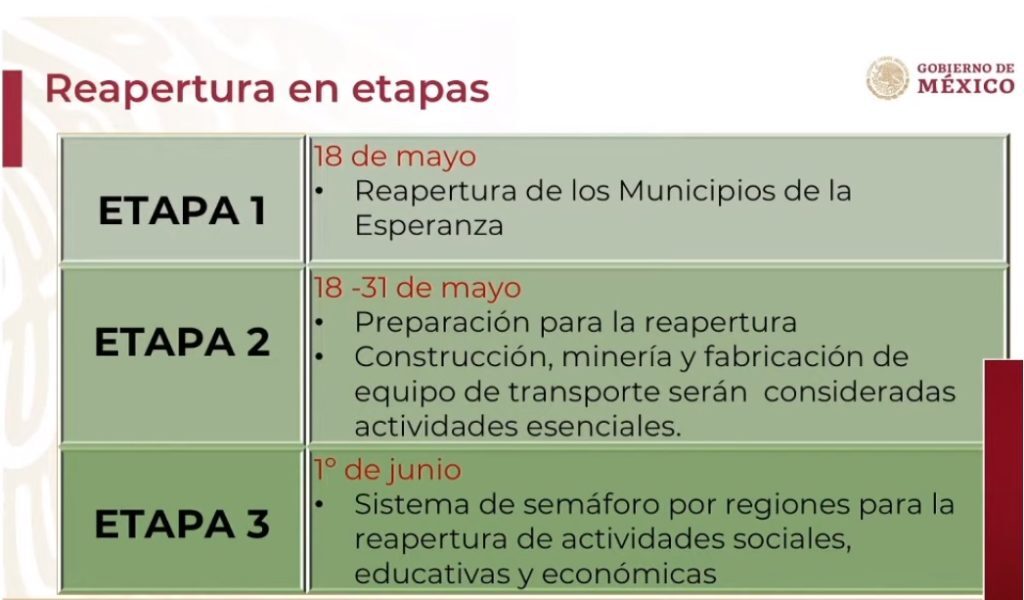 *La primera etapa comenzará a partir del 18 de mayo de 2020 con la reapertura de los denominados Municipios de la Esperanza, es decir, aquellos que no registran contagios y que además no colindan con otros territorios contagiados.