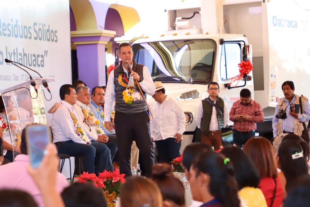 San Pedro Ixtlahuaca, Oax. 17 de diciembre de 2019. Con una inversión de 1.8 millones de pesos, el gobernador Alejandro Murat Hinojosa entregó un vehículo recolector de residuos sólidos que beneficiará a los más de ocho mil 500 habitantes de esta localidad.