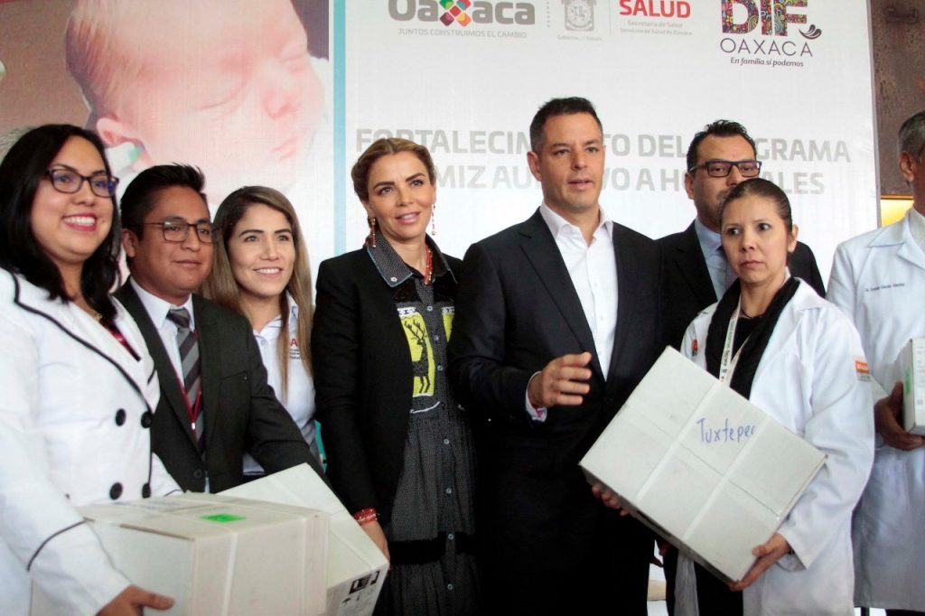 El gobernador Alejandro Murat Hinojosa y la presidenta honoraria del DIF Oaxaca, Ivette Morán entregaron de manera simbólica 7 equipos de emisiones otoacústicas – de un total de 34- a hospitales generales y comunitarios de la entidad.