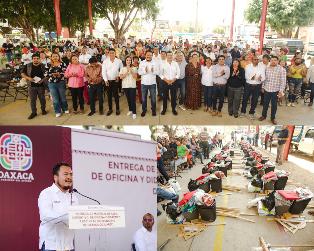 Oaxaca de Juárez, Oax. 5 de octubre de 2023.- Como parte del nuevo modelo de atención social que impulsa la administración del Gobernador Salomón Jara Cruz, el Instituto Estatal de Educación Pública de Oaxaca (IEEPO) entregó paquetes de material de aseo, deportivo, de oficina y didáctico a 83 planteles escolares de agencias municipales de Oaxaca de Juárez.