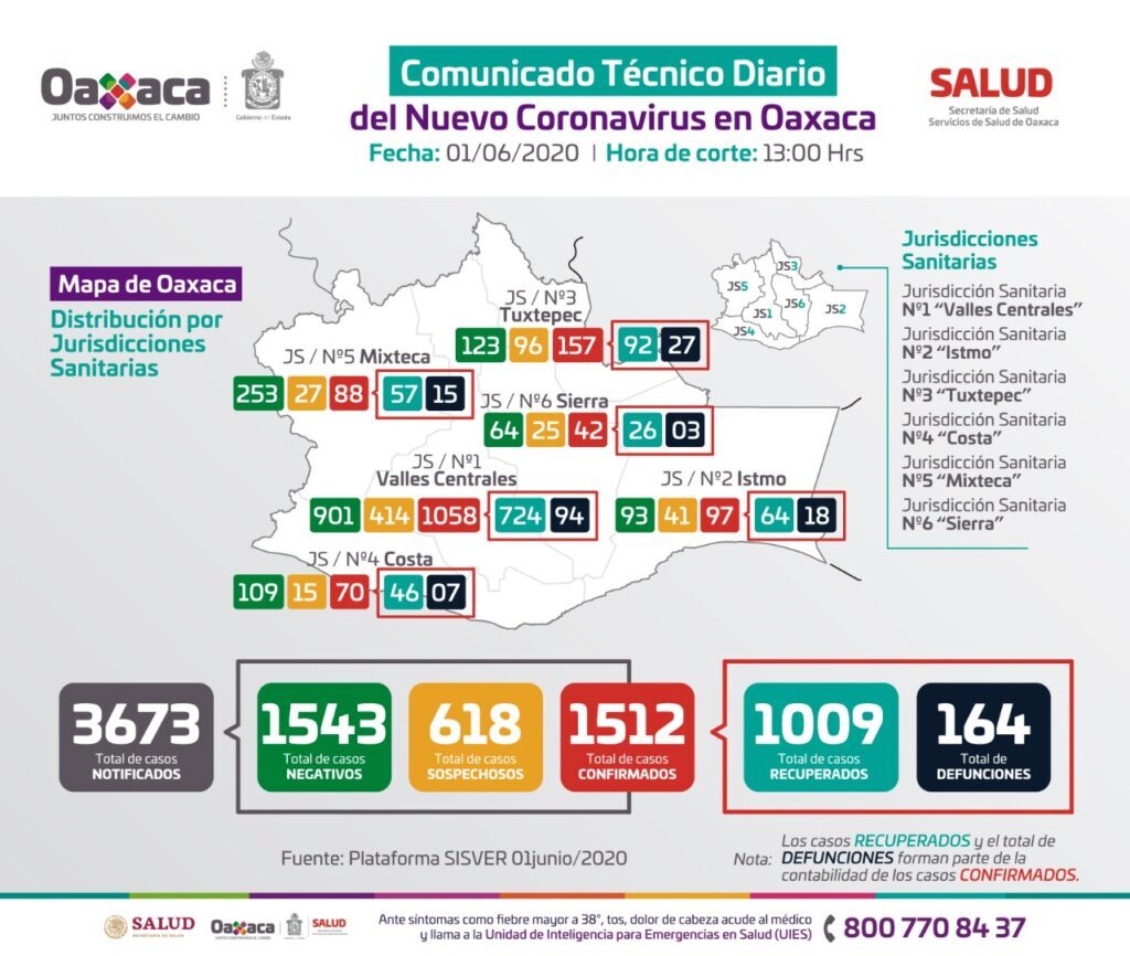 Oaxaca de Juárez, Oax. 1 de junio de 2020.- La subdirectora general de Innovación y Calidad de los Servicios de Salud de Oaxaca (SSO), Rosa Lilia García Kavanagh informó que al corte epidemiológico de este lunes 1 de junio, se han contabilizado 96 casos nuevos que suman mil 512 confirmados a COVID-19 en la entidad.