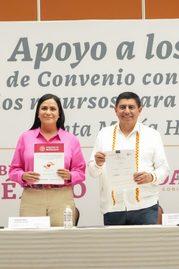 Santa María Huatulco, Oax. 28 de junio de 2023.- Para dar continuidad a las labores de apoyo a las familias afectadas y a la reconstrucción, a poco más de un año del impacto del huracán Agatha en la Costa de Oaxaca, el Gobernador del Estado Salomón Jara Cruz, y la secretaria de Bienestar del Gobierno de México, Ariadna Montiel Reyes, signaron un convenio con las autoridades municipales de las zonas afectadas para la entrega, en dos ministraciones, de mil 190 millones de pesos para la rehabilitación de la infraestructura,.