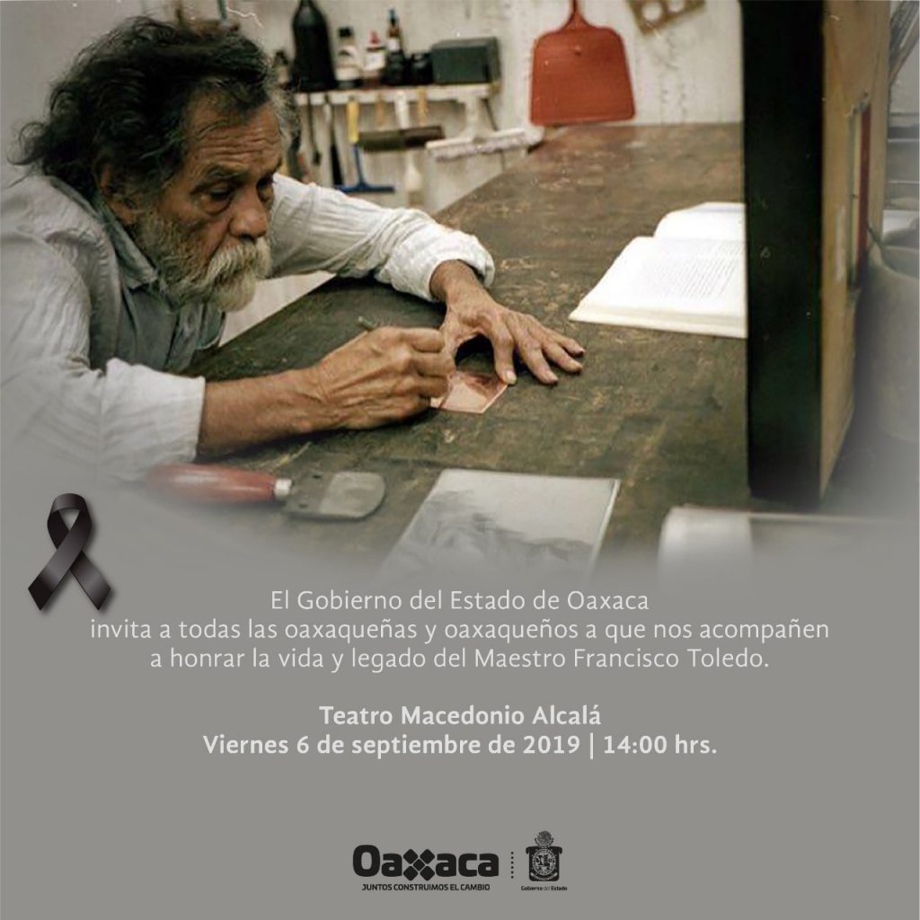 “Oaxaca está de luto por la pérdida de un artista universal: Francisco Toledo. Nos deja como legado su magnífica obra, su pasión por nuestro estado y su espléndida calidad humana”, afirmó.