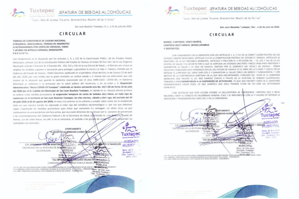 Tuxtepec, Oax.- A partir de este viernes entra en vigor el acuerdo del Cabildo tuxtepecano aprobado el pasado 18 de julio en el que se ordena la suspensión temporal de la venta de bebidas alcohólicas en cualquier tipo de negocio en todo el municipio de Tuxtepec, durante los días viernes, sábado y domingo, en el periodo que comprende del 24 de julio al 02 de agosto del presente año.