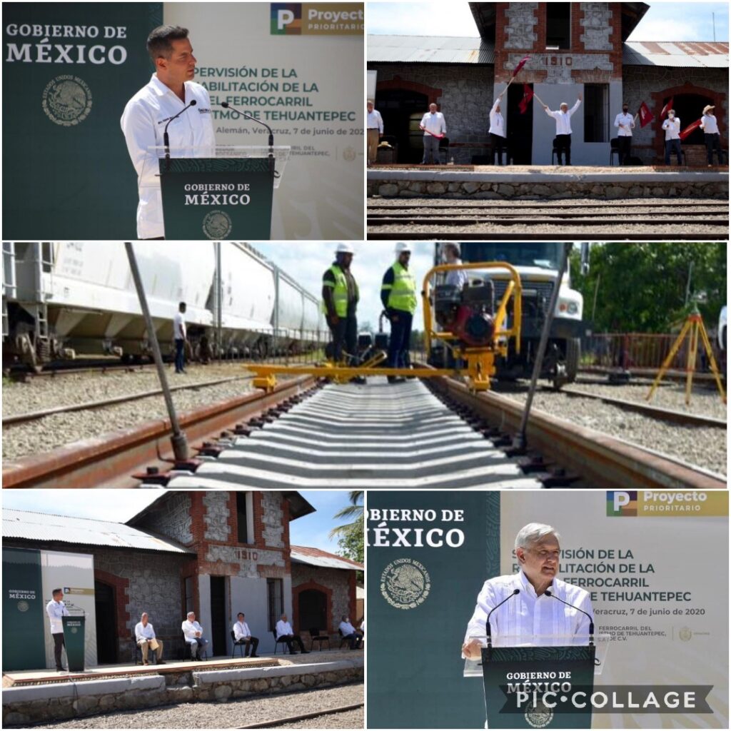Sayula de Alemán, Veracruz, 7 de junio de 2020. “Este proyecto será considerado como la llave que le abrió la oportunidad de prosperidad y bienestar al Sureste de México”, expresó el gobernador Alejandro Murat Hinojosa al participar en el banderazo de inicio de la modernización del ferrocarril interoceánico del Istmo de Tehuantepec, que este domingo puso en marcha el presidente Andrés Manuel López Obrador.