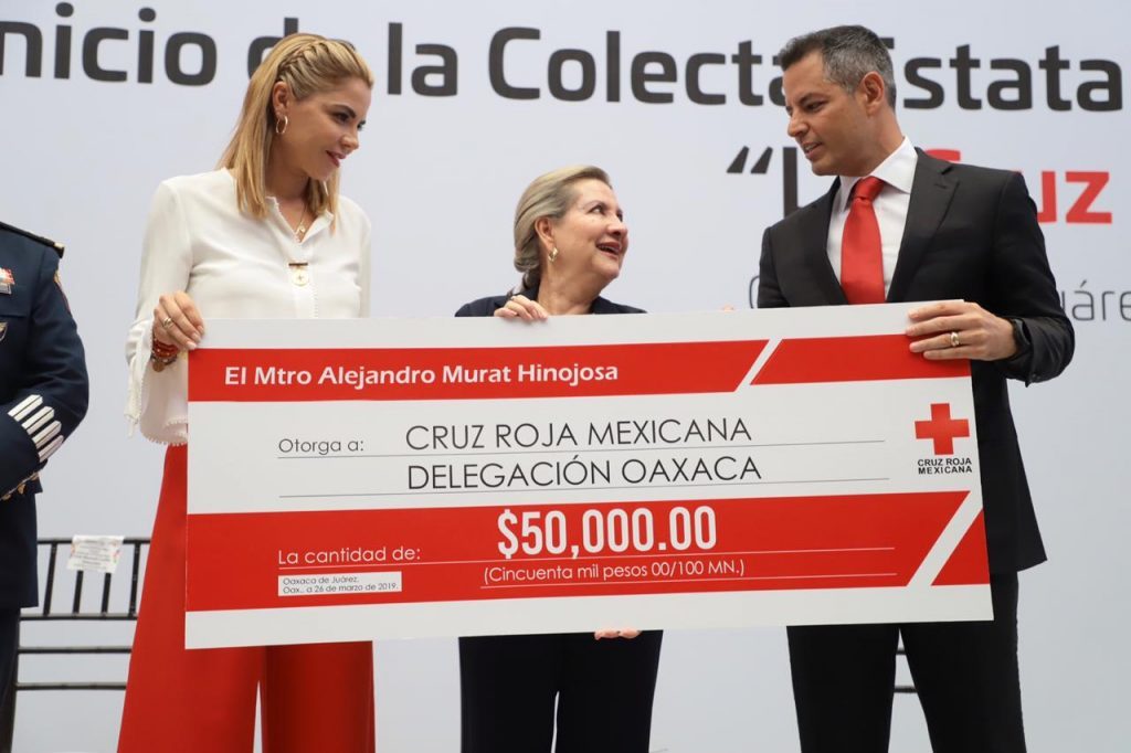 Luego de recibir un distintivo de manos del Gobernador y su esposa, Borges Yazegey, agradeció la aportación del Gobierno del Estado en el inicio de esta colecta, el cual se entregó a través de tres cheques: uno por 100 mil pesos de donativos a través del Monte de Piedad; otro por 50 mil pesos a nombre de la familia Murat; y uno más por 200 mil pesos que se destinarán para concluir la sede de la delegación en Pinotepa.