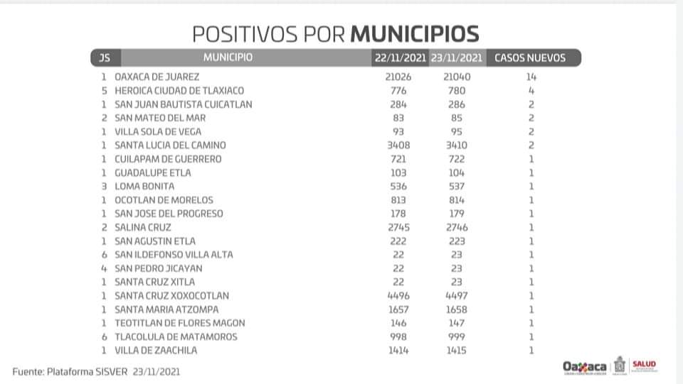 Oaxaca de Juárez es la demarcación con el mayor número de casos reportados en el último día, luego de cuantificar 14 positivos, seguido de la Heroica Ciudad de Tlaxiaco con cuatro, así como San Juan Bautista Cuicatlán, San Mateo del Mar, Villa Sola de Vega y Santa Lucía del Camino con dos cada uno; para un total de 21 municipios con pacientes nuevos.