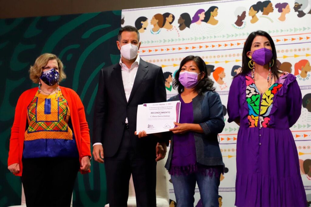 Asimismo, durante el evento, el gobernador Alejandro Murat Hinojosa, entregó reconocimientos a mujeres resilientes de violencia, beneficiarias y propietarias de las “Tienditas Comunitarias Segalmex”, como Eloísa García Jiménez, Mariela García Torres y Marciana Martínez Martínez.