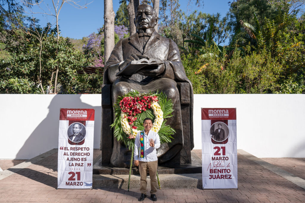 Oaxaca de Juárez, Oaxaca a 21 de marzo del 2023. Con motivo del 217 aniversario del natalicio de Benito Juárez García, el Comité Ejecutivo Estatal (CEE) de Morena Oaxaca homenajeó con una ofrenda floral al Benemérito de las Américas en San Pablo Guelatao.