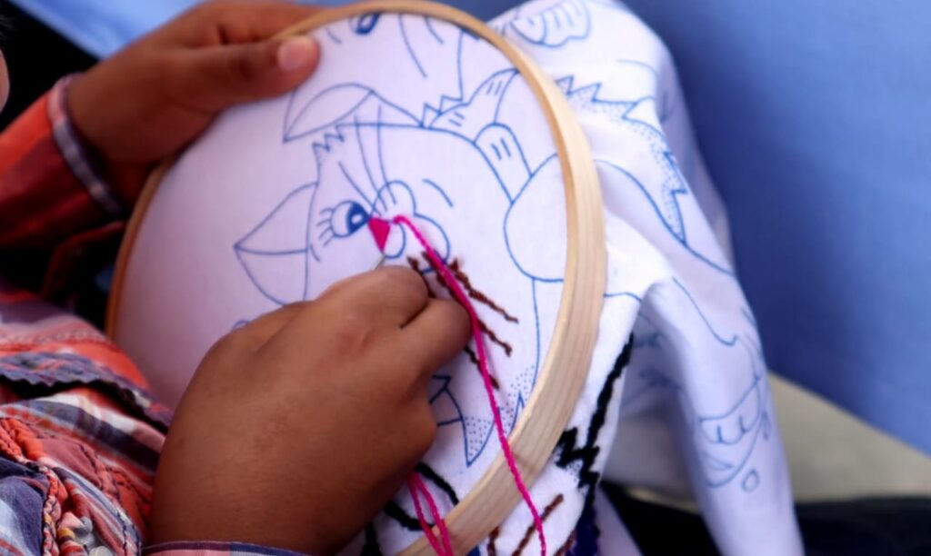 “Es grandioso ver cómo las niñas y niños en cada puntada reflejan el amor que tienen en su inocencia. Para mí, es una satisfacción enseñar lo que sé y enriquecer su amor. Es muy bonito trabajar con ellas y ellos”, comparte emocionada Eugenia Jiménez Madrigal.