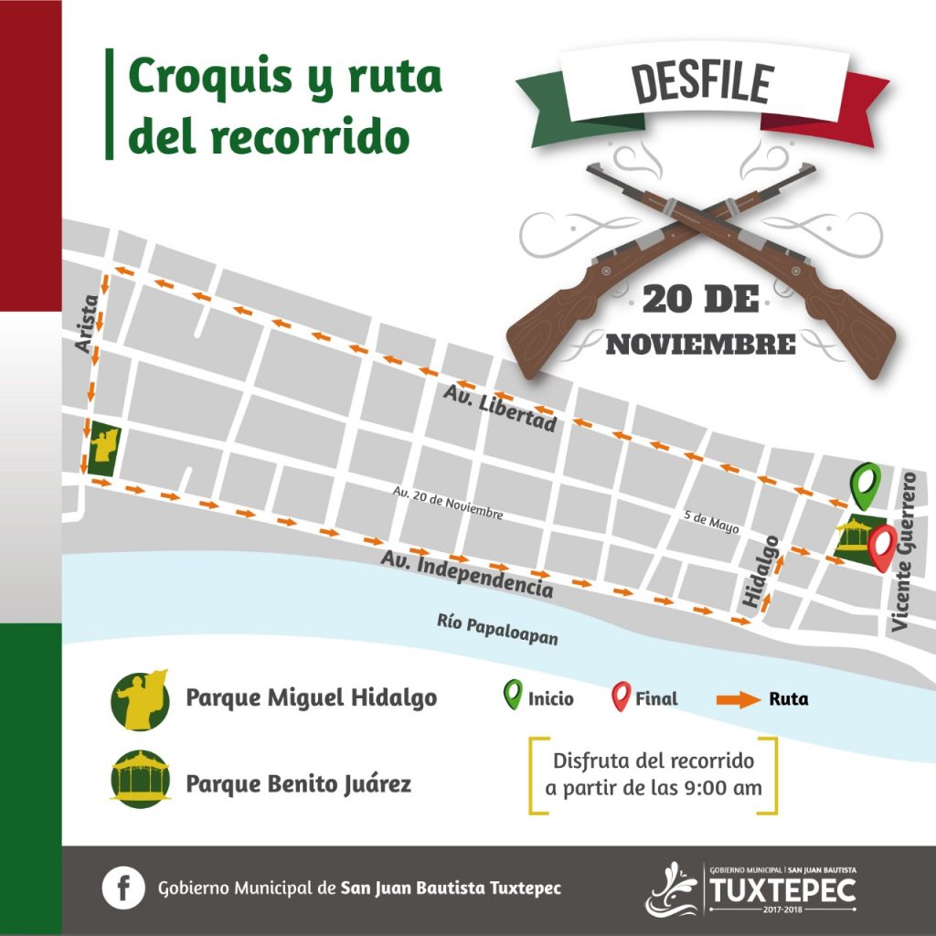 El Jefe de Educación del Gobierno Municipal de Tuxtepec, Rolando Alán Vargas Mayoral informó que con el apoyo de la Policía Vial el cierre de las calles y avenidas por donde pasará el Desfile Conmemorativo del Inicio de la Revolución Mexicana iniciará a partir de las 8 de la mañana, por lo que pide a quienes transitan por esta ruta tomen rutas alternas para llegar a los puntos de la ciudad a donde se dirijan.
