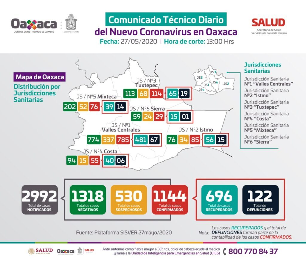 Oaxaca de Juárez, Oax. 27 de mayo de 2020.-Los Servicios de Salud de Oaxaca (SSO) informaron este miércoles, que la entidad ya registra mil 144 casos y 122 muertes por COVID-19, tras confirmarse 35 nuevos contagios y siete fallecimientos más, en las últimas 24 horas.