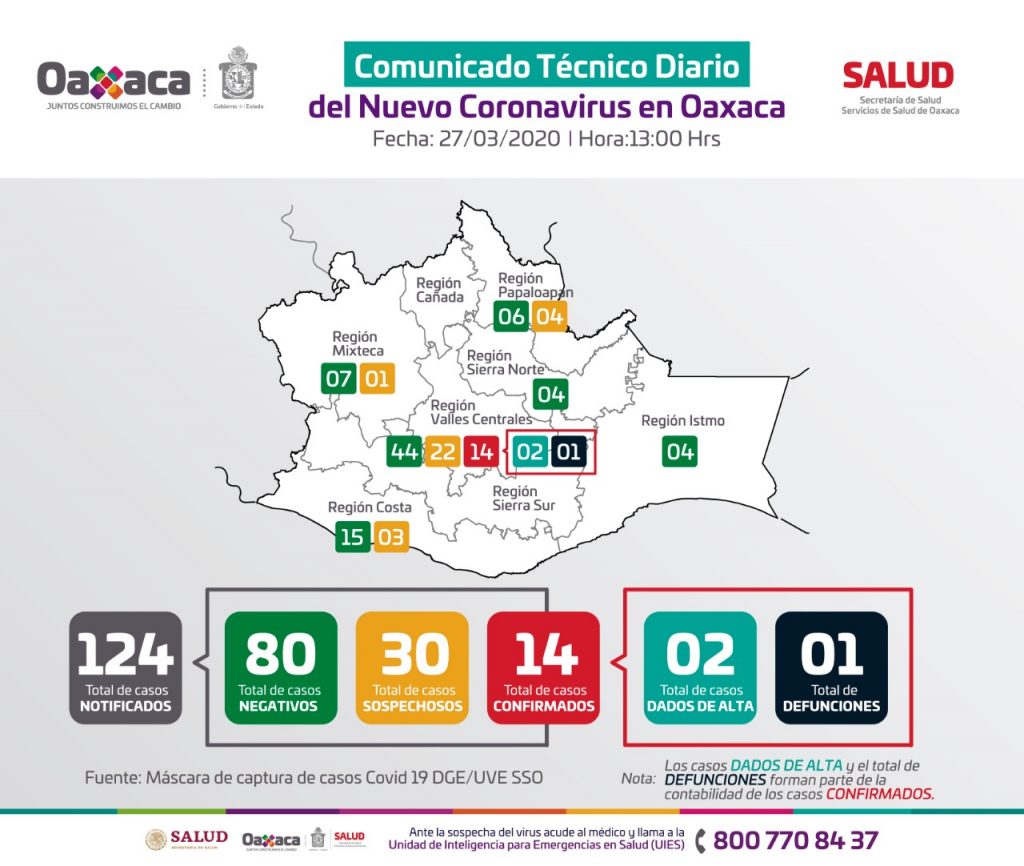 Indicó que se trata de un hombre de 44 años de edad, originario de la región de Valles Centrales, quien el pasado 26 de marzo comenzó a sentir molestias en su salud, por lo que se atendió en su domicilio a través de un médico particular el 27 de marzo, siendo el mismo médico quien notificó a los Servicios de Salud de Oaxaca como un caso sospechoso por COVID-19.