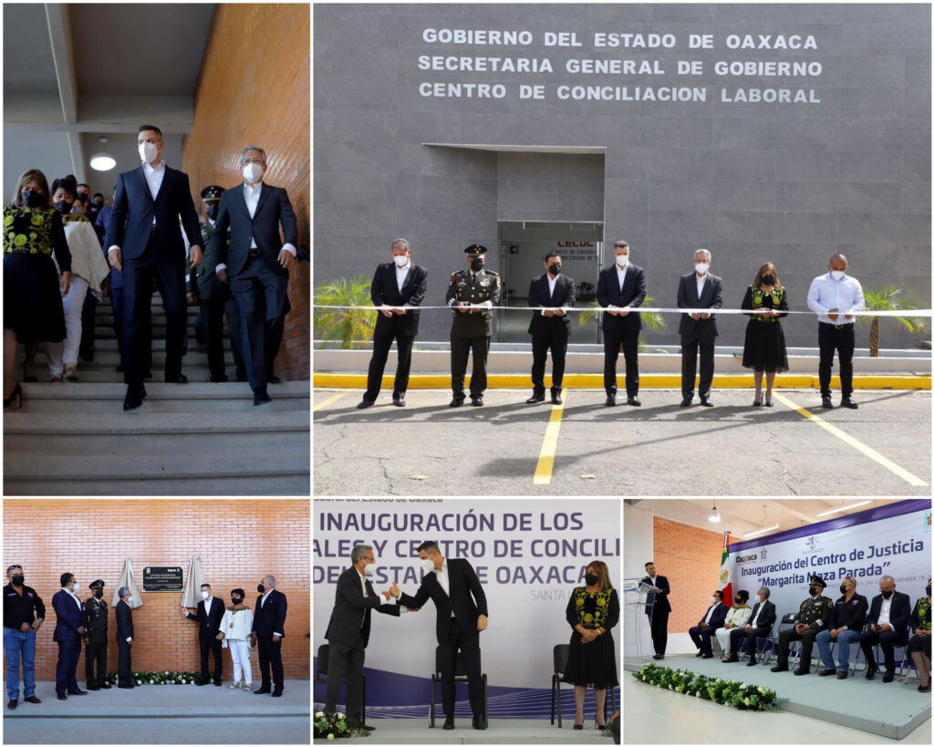 Región Valles Centrales, Oax. 03 de noviembre de 2021.- La implementación de la Reforma Laboral en Oaxaca y de diversas disposiciones en materia de seguridad pública y justicia penal, ya son una realidad, así quedó constatado por el gobernador Alejandro Murat Hinojosa a través de la inauguración de los Juzgados Laborales del Poder Judicial del Estado y el Centro de Conciliación Laboral del Estado de Oaxaca (Cecol) en Ixcotel y el Centro de Justicia “Margarita Maza Parada” de Tanivet.