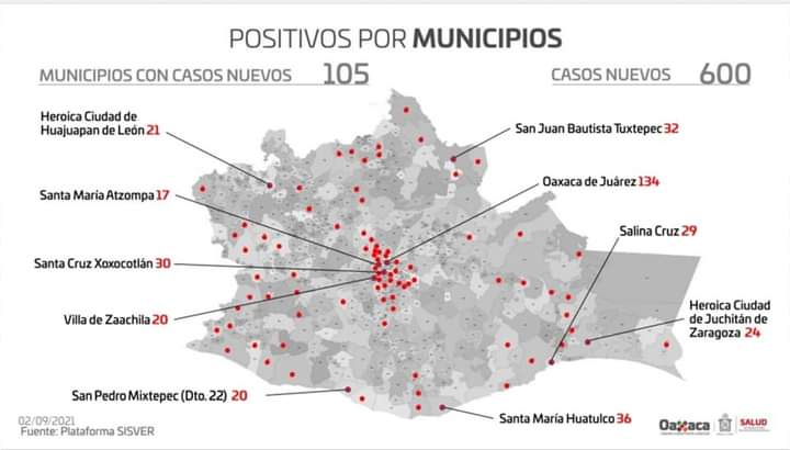 Los 600 casos nuevos, afectan a 105 municipios, entre los cuales destacan, Oaxaca de Juárez con 134 registros, Santa María Huatulco tiene 36, San Juan Bautista Tuxtepec 32, Santa Cruz Xoxocotlán 30, Salina Cruz 29, Heroica Ciudad de Juchitán de Zaragoza 24, Huajuapan de León 21, San Pedro Mixtepec (distrito 22) y Villa de Zaachila 20 cada uno, Santa María Atzompa 17 y Santo Domingo Tehuantepec 16.