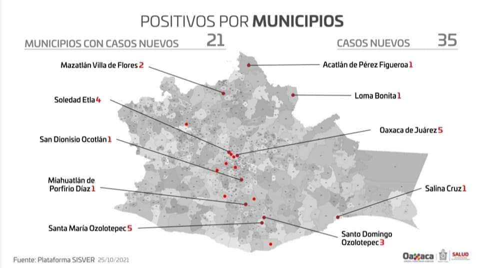 De los ayuntamientos con casos positivos en el último corte, Oaxaca de Juárez y Santa María Ozolotepec son los de mayor incidencia con cinco contagios cada uno, para un total de 20 mil 599 y 40 acumulados respectivamente, seguido de Soledad Etla con cuatro casos nuevos, para acumular 218, así como Santo Domingo Ozolotepec con tres pacientes, para un global de seis contagios acumulados, por mencionar algunos.