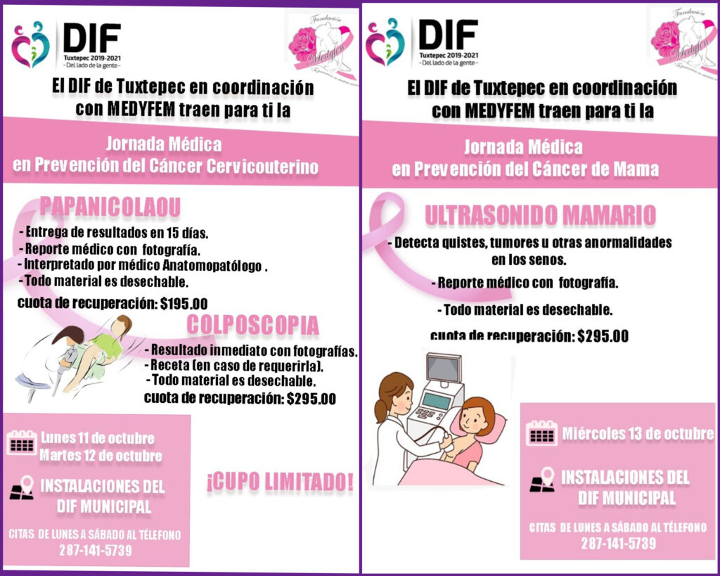 Tuxtepec, Oaxaca. Octubre 07 de 2021.- Con la finalidad de coadyuvar en las acciones para combatir el cáncer de mama y en apoyo a las mujeres de nuestro municipio, el DIF Municipal de Tuxtepec que preside Juanita Durán Azamar, en coordinación con la Asociación MEDYFEM, realizarán la Jornada en Prevención del Cáncer Cervocouterino y de Mama.