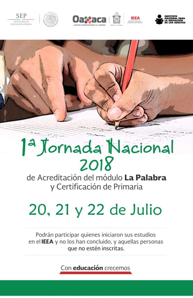 Oaxaca de Juárez, Oax. 16 de julio de 2018. El Instituto Estatal de Educación para Adultos (IEEA), convoca a jóvenes y personas adultas que deseen recibir su constancia de alfabetizado o certificado de primaria, a participar en la Primera Jornada Nacional 2018 que el Instituto Nacional para la Educación de los Adultos (INEA) realizará del 20 al 22 de julio.