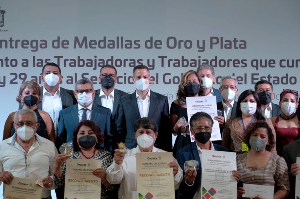 Acompañado del secretario de Administración, Germán Espinosa Santibáñez y del secretario general del Sindicato de Trabajadores de los Poderes del Estado e Instituciones Descentralizadas de Carácter Estatal de Oaxaca (STPEIDCEO), Juan Ignacio Cruz Villavicencio, el Mandatario Estatal entregó medallas de oro a 529 mujeres y hombres por 29 años y medallas de plata a 369 con 20 y 25 años al servicio de los tres poderes del Estado.