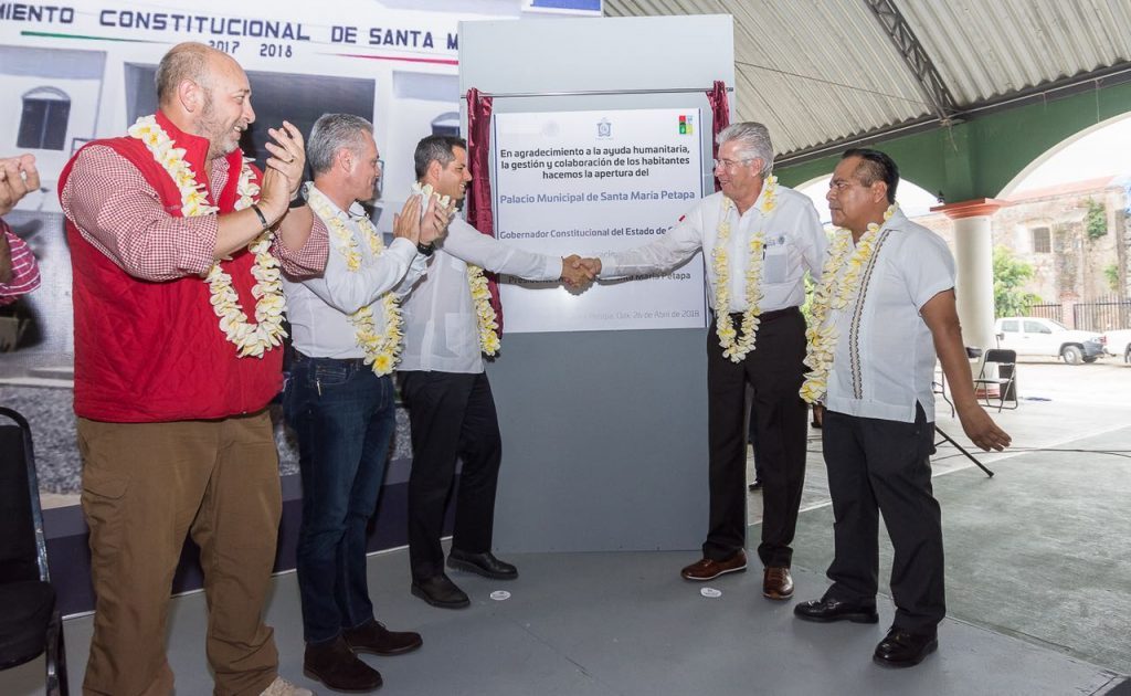Fue así como el pasado 26 de abril de este año, el Gobernador del Estado Alejandro Murat Hinojosa, acompañado del Titular de la Secretaría de Comunicaciones y Transportes, Gerardo Ruiz Esparza, hicieron entrega al pueblo de Santa María Petapa del nuevo edificio que alberga el reconstruido Palacio Municipal.