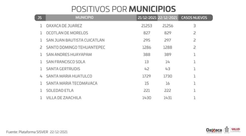 Los 16 casos nuevos se distribuyen en 11 municipios, siendo los más afectados: Oaxaca de Juárez con tres, Ocotlán de Morelos, San Juan Bautista Cuicatlán, y Santo Domingo Tehuantepec dos cada uno, el resto un solo caso.